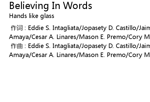 | [00:00.000] | 作词 : Eddie S. Intagliata/Jopasety D. Castillo/Jaime E. Amaya/Cesar A. Linares/Mason E. Premo/Cory M. McMahan |