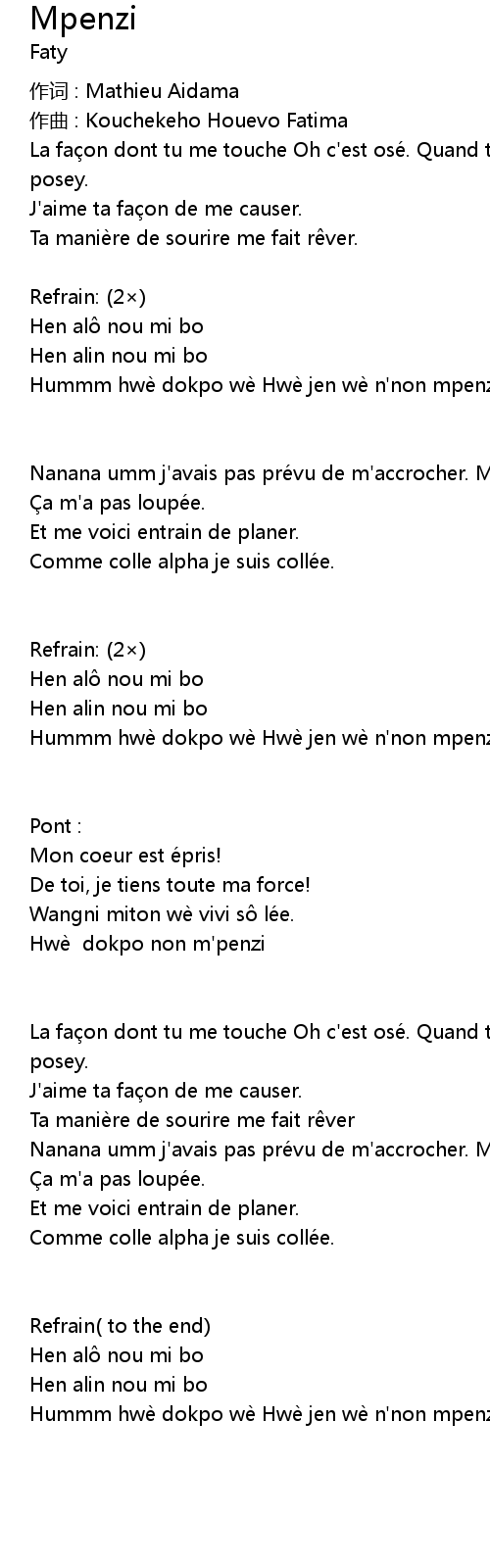 | Hummm hwè dokpo wè Hwè jen wè n'non mpenzi. |