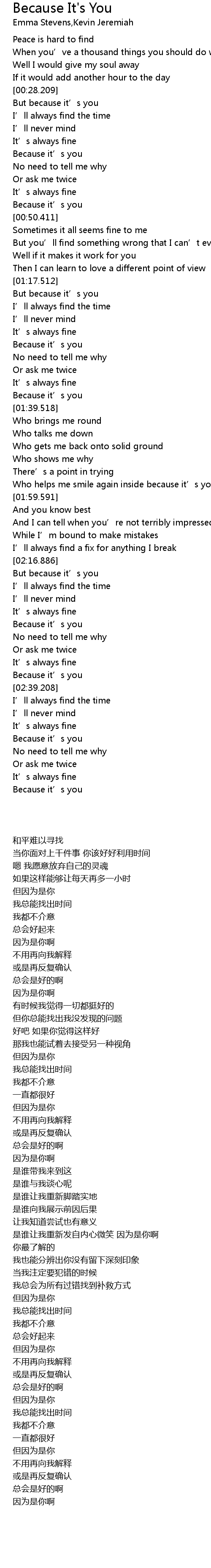 | [01:54.408] | Who helps me smile again inside because it’s you |