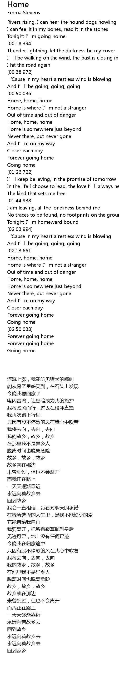 | [02:18.327] | Home is where I' m not a stranger |