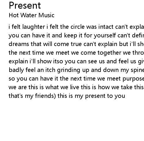 i felt laughter i felt the circle was intact can't explain but i'll show it so you can have it and keep it for yourself can't define the power redefinitions of dreams that will come true can't explain but i'll show it so you will have it the next time we meet we come together we throw our worlds aside for that can't explain i'll show itso you can see us and feel us give our hearts i shake so badly feel an itch grinding up and down my spine can't explain but i'll show you so you can have it the next time we meet purpose shines body's numb this is what we are this is what we live this is how we take this is how we give (cause that's my friends) this is my present to you |