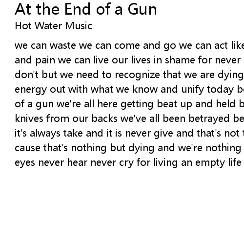 we can waste we can come and go we can act like we don't know about suffering and pain we can live our lives in shame for never helping anyone we know or don't but we need to recognize that we are dying if we live alone let's send our energy out with what we know and unify today because our freedom sits at the end of a gun we're all here getting beat up and held back we're all here digging knives from our backs we've all been betrayed because it's business not people it's always take and it is never give and that's not the way i want to live cause that's nothing but dying and we're nothing if we sell ourselves close your eyes never hear never cry for living an empty life |