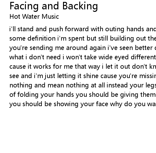 i'll stand and push forward with outing hands and clear lines and i'll figure some definition i'm spent but still building out the words drawn the lines now you're sending me around again i've seen better days still i'll hold my ways what i don't need i won't take wide eyed different view stationed and seeing use cause it works for me that way i let it out don't know if it's true it's what i see and i'm just letting it shine cause you're missing all the energy you're nothing and mean nothing at all instead your legs should be standing up instead of folding your hands you should be giving them out instead of turning your back you should be showing your face why do you walk away |