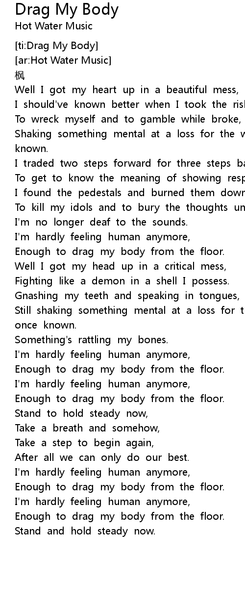 | [02:46.60] | I'm hardly feeling human anymore, |
