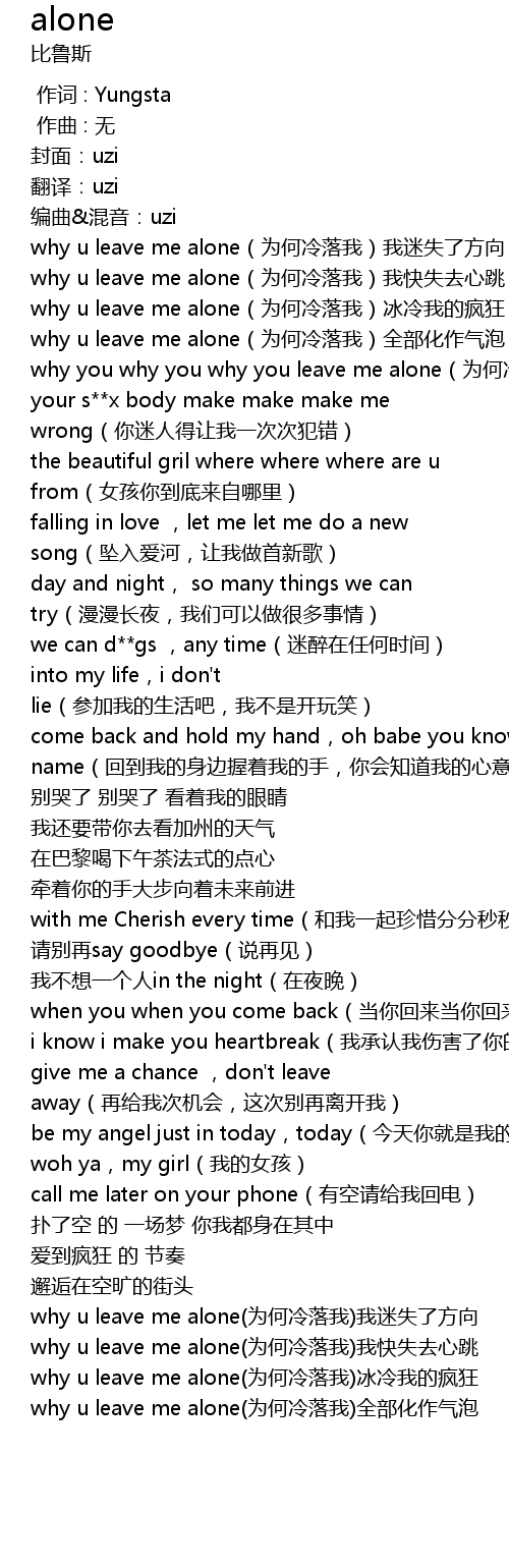 | [00:23.275] | why u leave me alone wei he leng luo wo quan bu hua zuo qi pao |