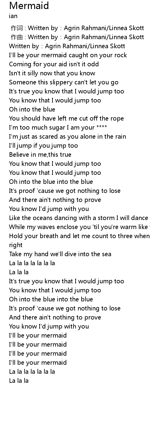 | [00:07.975] | I' ll be your mermaid caught on your rock |