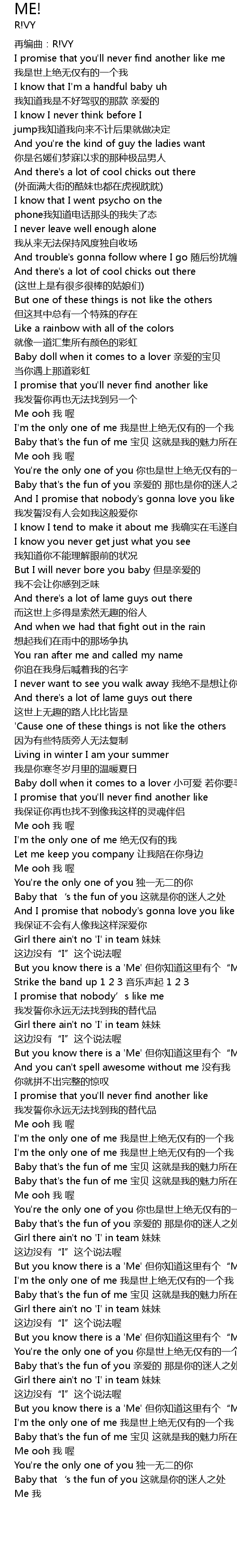 | [00:01.100] | I promise that you'll never find another like me 我是世上绝无仅有的一个我 |