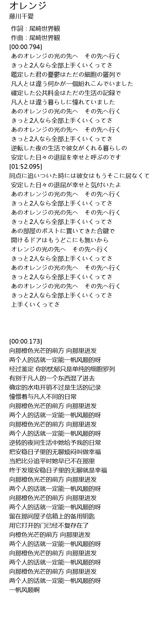 | [02:54.609] | オレンジの光の先へ その先へ行く |