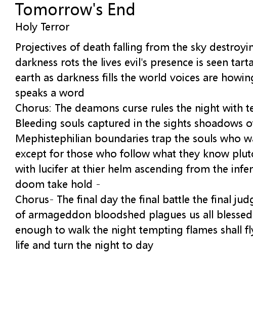 Chorus- The final day the final battle the final judgement call bleeding souls of armageddon bloodshed plagues us all blessed enough to see the light blind enough to walk the night tempting flames shall fly who's the one to save your life and turn the night to day |
