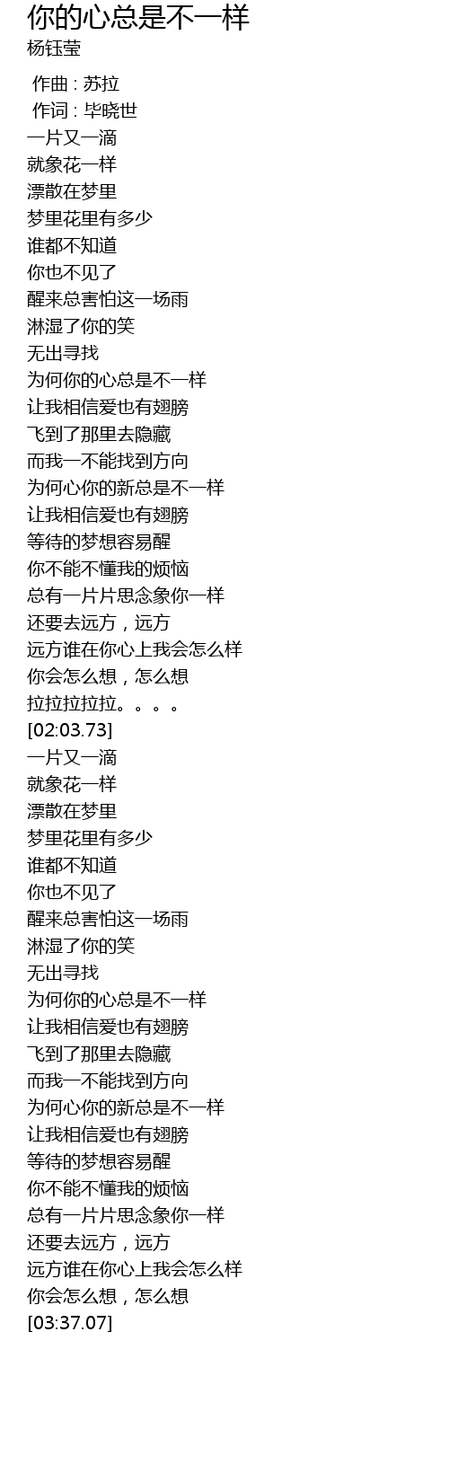 | [02:34.80] | wèi hé nǐ de xīn zǒng shì bù yí yàng |