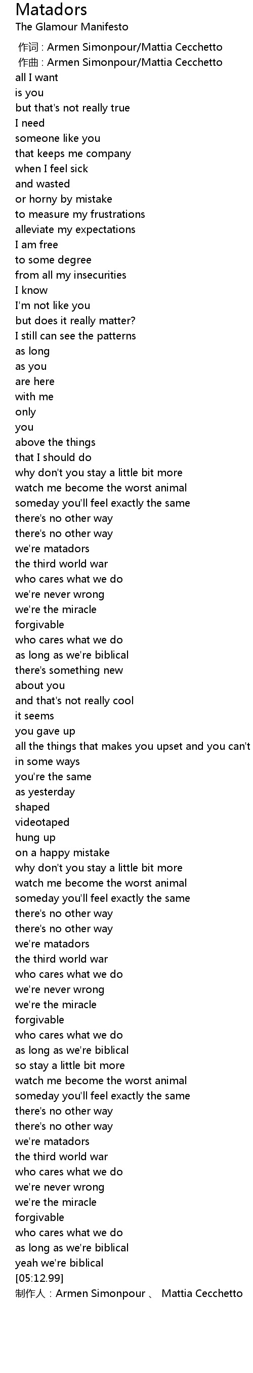 | [05:13.99] | 制作人:Armen Simonpour 、 Mattia Cecchetto |
