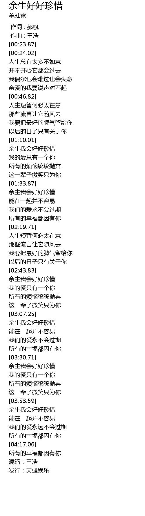 | [03:53.91] | yú shēng wǒ huì hǎo hǎo zhēn xī |