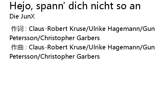 | [00:00.000] | 作词 : Claus-Robert Kruse/Ulrike Hagemann/Gunnar Petersson/Christopher Garbers |