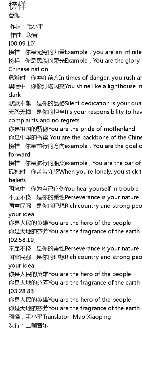 | [00:41.67] | 榜样 你是民族的荣光Example,You are the glory of the Chinese nation |