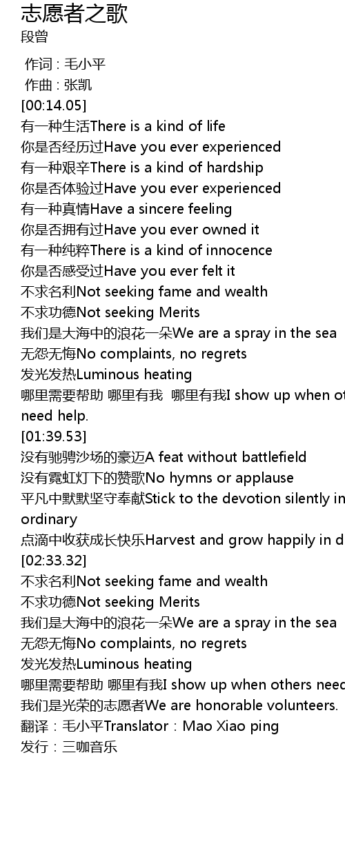 | [03:08.48] | wǒ men shì guāng róng de zhì yuàn zhě We are honorable volunteers. |