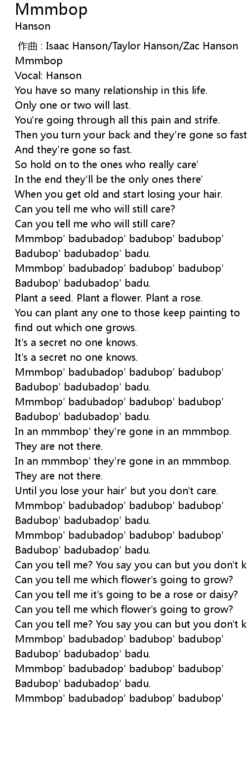 | [00:55.50] | Mmmbop' badubadop' badubop' badubop' |