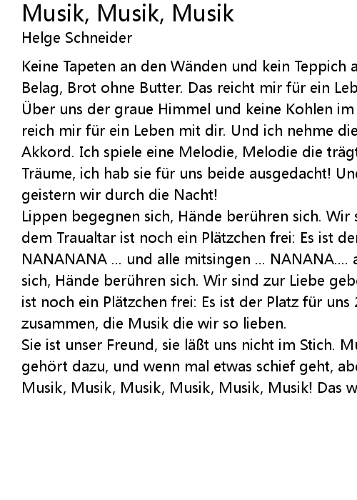 | Keine Tapeten an den W nden und kein Teppich auf dem Boden nur einfachster Belag, Brot ohne Butter. Das reicht mir fü r ein Leben mit dir, mein Schatz! Ü ber uns der graue Himmel und keine Kohlen im Ofen nur ein Bett aus Stroh. Das reich mir fü r ein Leben mit dir. Und ich nehme die Gitarre und ich greife einen Akkord. Ich spiele eine Melodie, Melodie die tr gt uns fort. Melodie der Tr ume, ich hab sie fü r uns beide ausgedacht! Und wie 2 Schwalben im Wind geistern wir durch die Nacht! | |