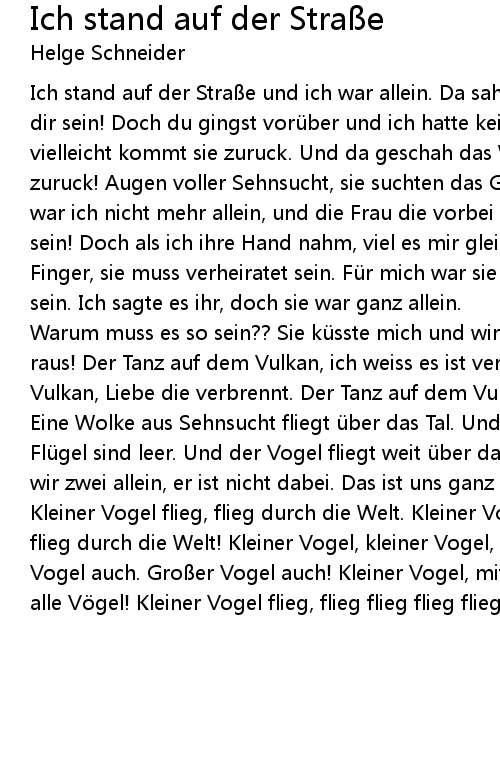 | Kleiner Vogel flieg, flieg durch die Welt. Kleiner Vogel flieg! Kleiner Vogel flieg durch die Welt! Kleiner Vogel, kleiner Vogel, flieg, flieg, flieg. Gro er Vogel auch. Gro er Vogel auch! Kleiner Vogel, mittlerer Vogel, gro er Vogel, alle V gel! Kleiner Vogel flieg, flieg flieg flieg flieg! |