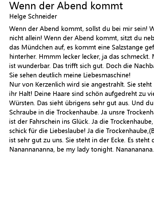 | Wenn der Abend kommt, sollst du bei mir sein! Wenn der Abend kommt, bist du nicht allein! Wenn der Abend kommt, sitzt du neben mir auf der Couch! Schnell das Mündchen auf, es kommt eine Salzstange geflogen. Und noch ein Gürkchen hinterher. Hmmm lecker lecker, ja das schmeckt. Meine Eltern sind nicht da, das ist wunderbar. Das trifft sich gut. Doch die Nachbarn, gucken durch die Gardine. Sie sehen deutlich meine Liebesmaschine! | |