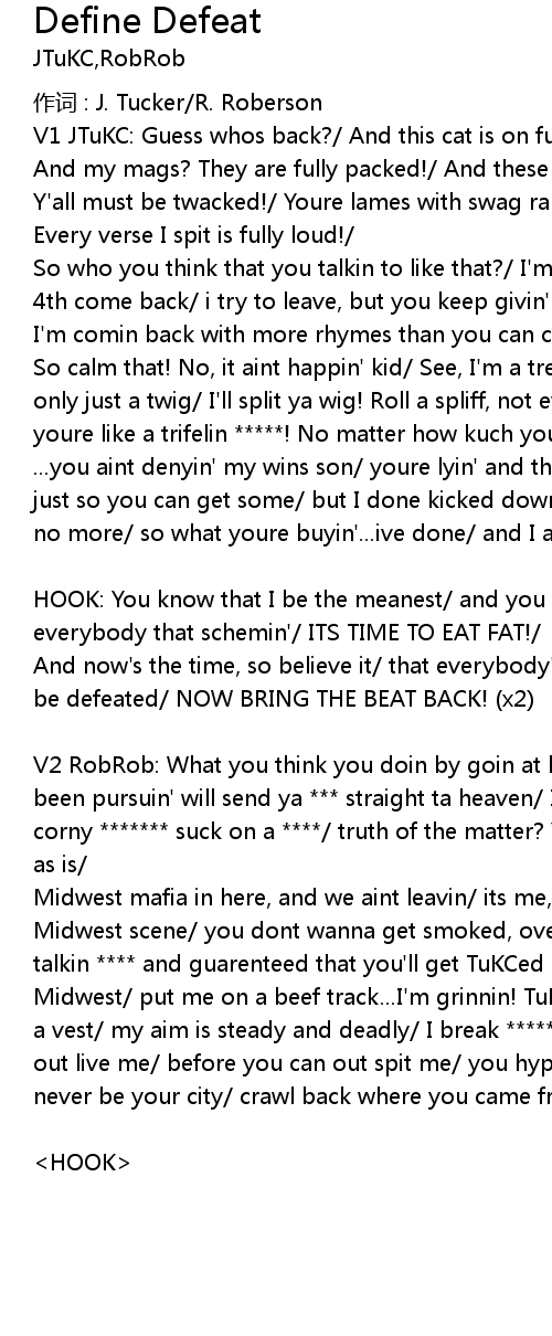 | And now' s the time, so believe it that everybody' s him see it that I will not be defeated NOW BRING THE BEAT BACK! x2 | |