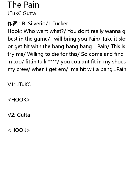 | Hook: Who want what? You dont really wanna get in the middle of this Im the best in the game i will bring you Pain Take it slow slow your role lil homie or get hit with the bang bang bang... Pain This is my livelihood so come and try me Willing to die for this So come and find me dont know what your gettin in too fittin talk you couldnt fit in my shoes sick of dudes belittlin my crew when i get em ima hit wit a bang... Pain! | |