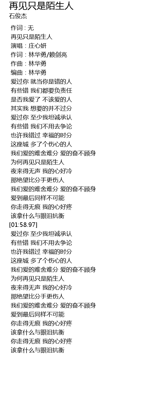 | [00:00.85] | 再见只是陌生人 |