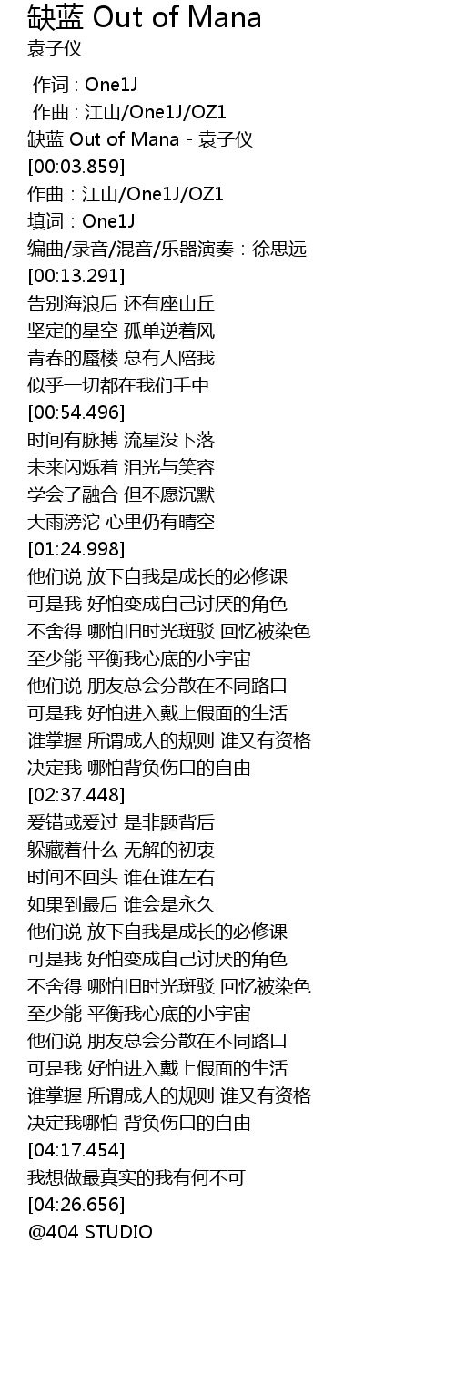 | [00:00.000] | 缺蓝 Out of Mana - 袁子仪 |