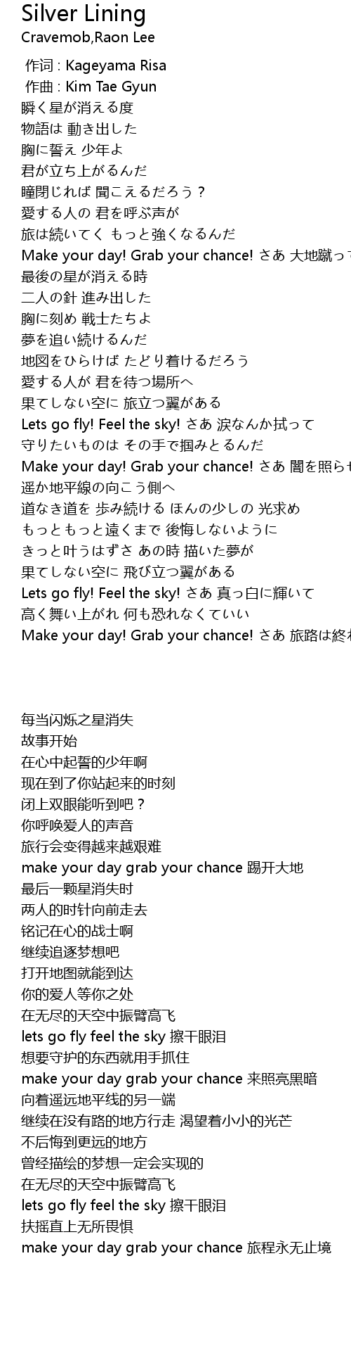 | [02:52.71] | Lets go fly! Feel the sky! zhēn bái huī |