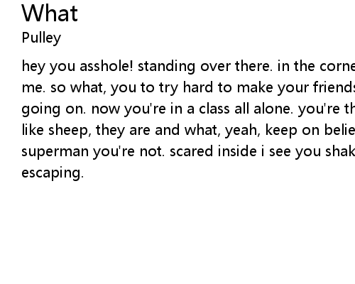 | hey you asshole! standing over there. in the corner bringing all you cheer to me. so what, you to try hard to make your friends insecurities, it keeps you going on. now you're in a class all alone. you're the leader, and they follow like sheep, they are and what, yeah, keep on believing you. make a difference a superman you're not. scared inside i see you shaking. scared inside there's no escaping. |