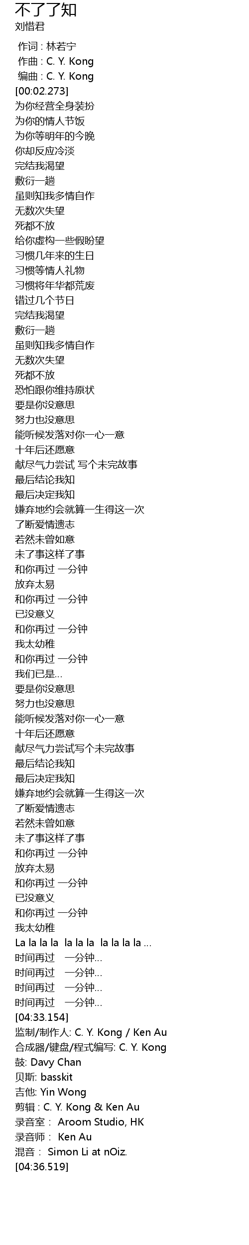 | [04:33.693] | 监制/制作人: C. Y. Kong / Ken Au |