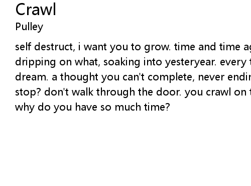 | self destruct, i want you to grow. time and time again just like a faucet dripping on what, soaking into yesteryear. every time you work you say it's a dream. a thought you can't complete, never ending, haunting. why don't they stop? don't walk through the door. you crawl on the floors. why can't you see? why do you have so much time? |