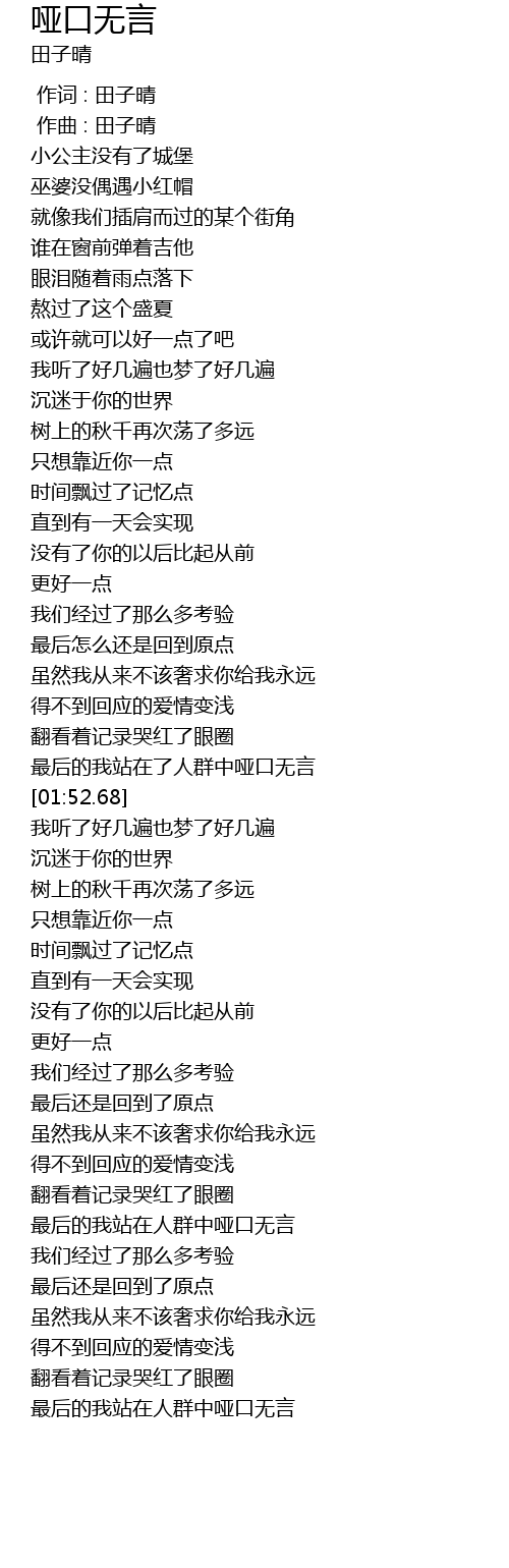 | [03:37.21] | zuì hòu de wǒ zhàn zài rén qún zhōng yǎ kǒu wú yán |