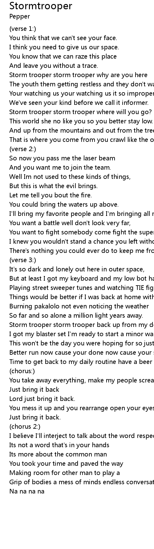 | Storm trooper storm trooper back up from my door | |