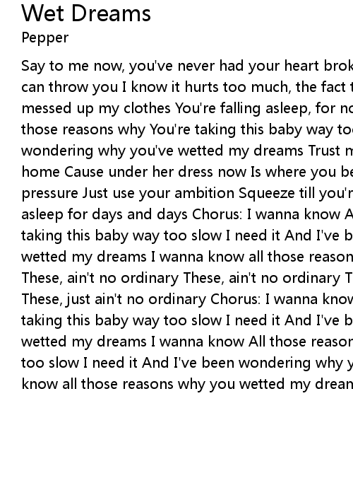 Say to me now, you've never had your heart broken Don't believe you, as far as I can throw you I know it hurts too much, the fact that she'll leave you You messed up my clothes You're falling asleep, for now Chorus: I wanna know All those reasons why You're taking this baby way too slow I need it And I've been wondering why you've wetted my dreams Trust me why I say She'll never be coming home Cause under her dress now Is where you belong So don't buckle from the pressure Just use your ambition Squeeze till you're tired She'll be falling asleep for days and days Chorus: I wanna know All those reasons why You're taking this baby way too slow I need it And I've been wondering why you've wetted my dreams I wanna know all those reasons why you've wetted my dreams These, ain't no ordinary These, ain't no ordinary These, ain't no ordinary These, just ain't no ordinary Chorus: I wanna know All those reasons why You're taking this baby way too slow I need it And I've been wondering why you've wetted my dreams I wanna know All those reasons why You're taking this baby way too slow I need it And I've been wondering why you've wetted my dreams I wanna know all those reasons why you wetted my dreams |
