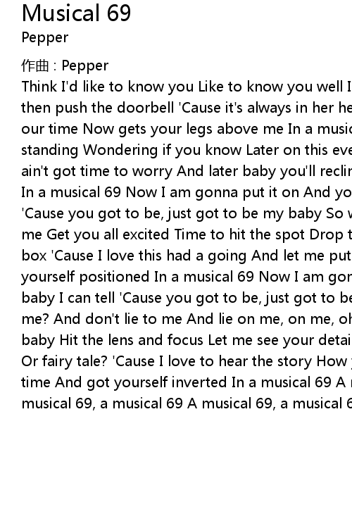 | Think I' d like to know you Like to know you well I hear a rhythm knocking And then push the doorbell ' Cause it' s always in her head Well baby we could take our time Now gets your legs above me In a musical 69 I see you there just standing Wondering if you know Later on this evening We' ll be head to toe But I ain' t got time to worry And later baby you' ll recline Now get yourself around me In a musical 69 Now I am gonna put it on And you want to, oh baby I can tell ' Cause you got to be, just got to be my baby So won' t you lie on me? Come lie on me Get you all excited Time to hit the spot Drop the tempo for you On your music box ' Cause I love this had a going And let me put this down in rhyme And get yourself positioned In a musical 69 Now I am gonna put it on And you want to, oh baby I can tell ' Cause you got to be, just got to be my baby So won' t you lie on me? And don' t lie to me And lie on me, on me, oh, oh, oh Got to be, got to be my baby Hit the lens and focus Let me see your detail Are you a perfect situation Or fairy tale? ' Cause I love to hear the story How you flipped it once upon a time And got yourself inverted In a musical 69 A musical 69, a musical 69 A musical 69, a musical 69 A musical 69, a musical 69 A musical 69 |