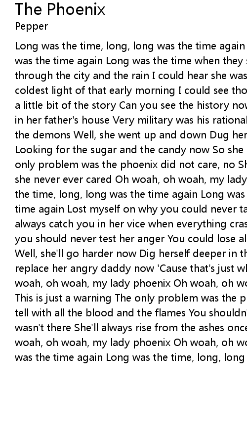 Long was the time, long, long was the time again Long was the time, long, long was the time again Long was the time when they say the phoenix was calling Even through the city and the rain I could hear she was falling Found her in the coldest light of that early morning I could see those cuts and bruises only told a little bit of the story Can you see the history now? Looked up like a secret in her father's house Very military was his rationale And he was the worst of the demons Well, she went up and down Dug herself deep into the underground Looking for the sugar and the candy now So she gave away all the feelings The only problem was the phoenix did not care, no She let me burn by her side 'cause she never ever cared Oh woah, oh woah, my lady phoenix Oh woah, oh woah Long was the time, long, long was the time again Long was the time, long, long was the time again Lost myself on why you could never take advantage twice She will always catch you in her vice when everything crashes This is a warning for you, you should never test her anger You could lose all you have in this world, yeah Well, she'll go harder now Dig herself deeper in the underground Looking to replace her angry daddy now 'Cause that's just what burns at this phoenix Oh woah, oh woah, my lady phoenix Oh woah, oh woah, yeah, yeah, yeah, yeah, yeah This is just a warning The only problem was the phoenix wasn't there How could I tell with all the blood and the flames You shouldn't tempt her if your loving wasn't there She'll always rise from the ashes once again, once again, yeah Oh woah, oh woah, my lady phoenix Oh woah, oh woah Long was the time, long, long was the time again Long was the time, long, long was the time again |