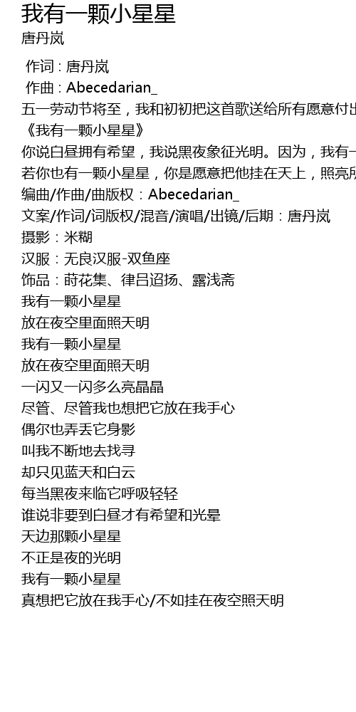 | [00:02.699] | ni shuo bai zhou yong you xi wang, wo shuo hei ye xiang zheng guang ming. yin wei, wo you yi ke xiao xing xing. |