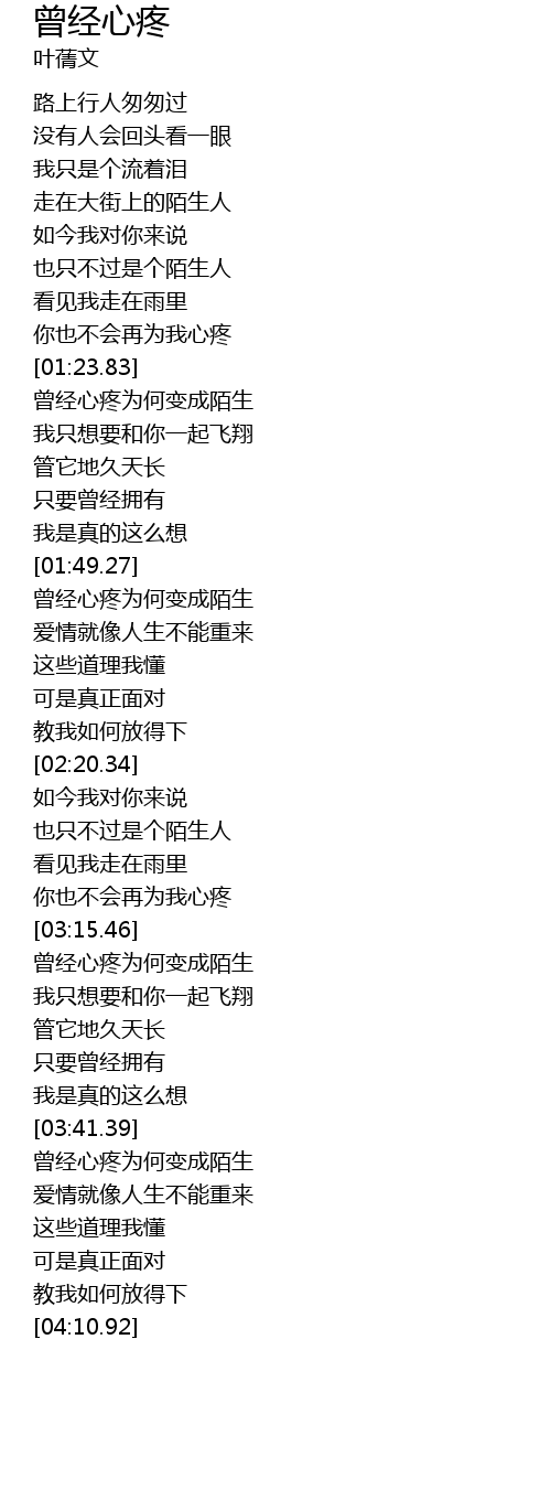 | [01:51.42] | 曾经心疼为何变成陌生 |