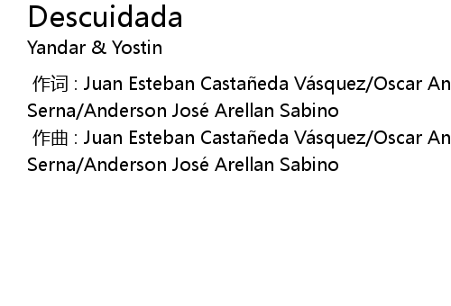 | [00:00.000] | 作词 : Juan Esteban Castañeda Vásquez/Oscar Andrés Gutiérrez Serna/Anderson José Arellan Sabino |