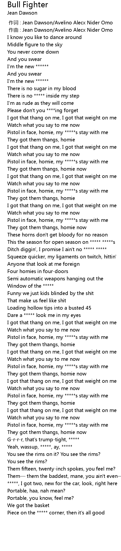 | [01:55.51] | Pistol in face, homie, my *****s stay with me |