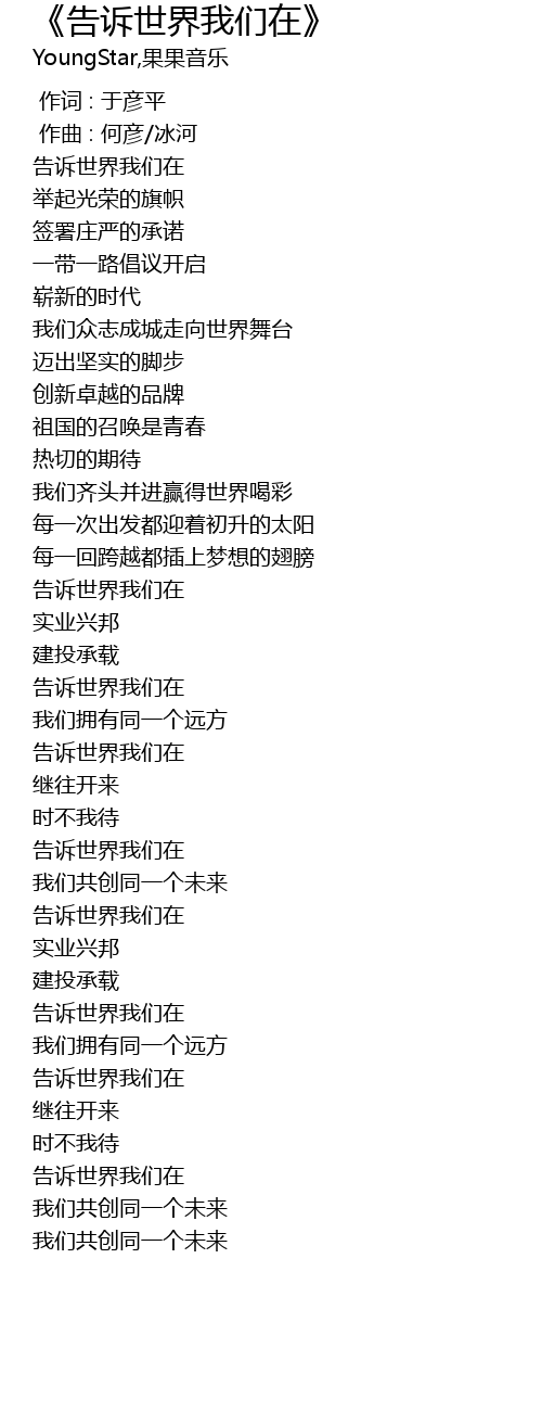 | [00:39.470] | 我们众志成城走向世界舞台 |