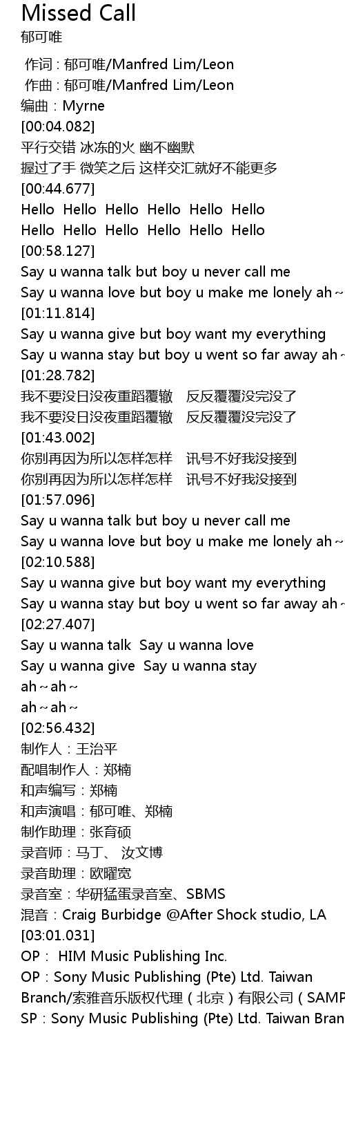 | [03:01.765] | OP: Sony Music Publishing Pte Ltd. Taiwan Branch suo ya yin yue ban quan dai li bei jing you xian gong si SAMP Beijing Co., Ltd |