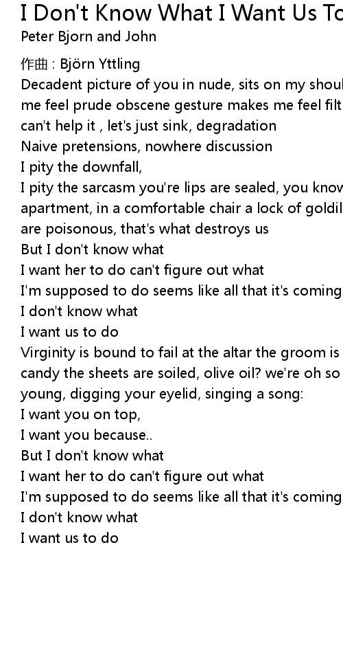 | Decadent picture of you in nude, sits on my shoulder whispers in my ear, makes me feel prude obscene gesture makes me feel filthy, makes you feel guilty, still can' t help it , let' s just sink, degradation | |