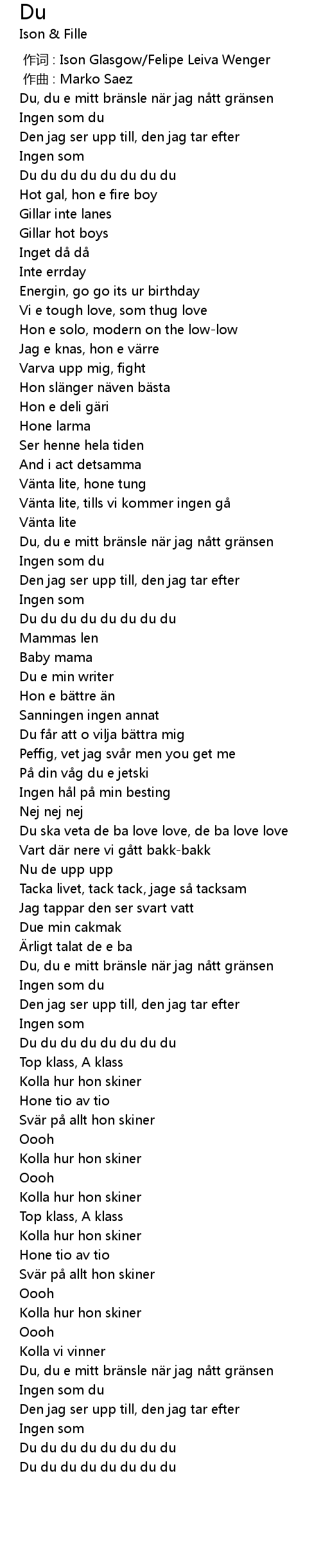 | [00:12.32] | Du, du e mitt br nsle n r jag n tt gr nsen |