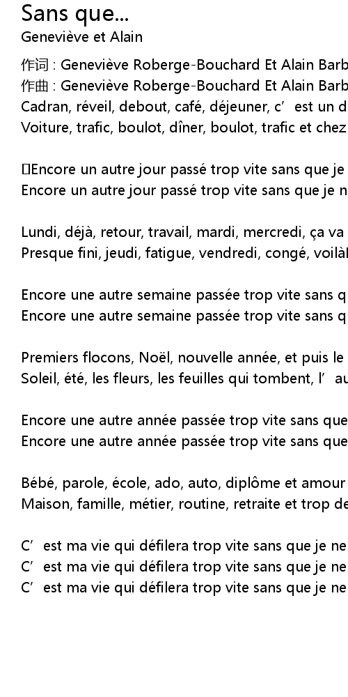 | 作词 : Geneviève Roberge-Bouchard Et Alain Barbeau | |