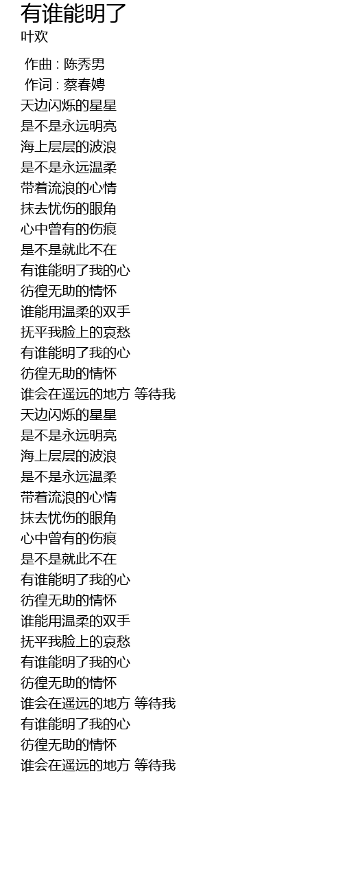 | [03:24.53] | yǒu shuí néng míng liǎo wǒ de xīn |