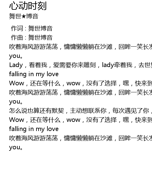 | [02:23.990] | Wow, hai zai deng shen me, wow, mei you le xuan ze, hei, kuai lai dao wo shen bian Lady, kan zhe wo, ai xu yao ni lai diao ke, lady qian zhe wo, qu shi jie de jin tou. baby, kan zhe wo, zhe shi xin tiao de shi ke, baby, qian zhe wo, I falling in my love |