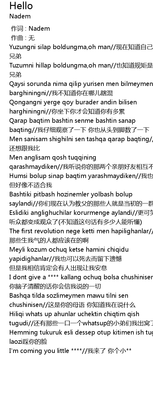 | [00:54.785] | Hiliqi whats up ahunlar uchektin chiqtim qish tugudi//还有那些一口一个whatsup的小弟们我出窝了 |