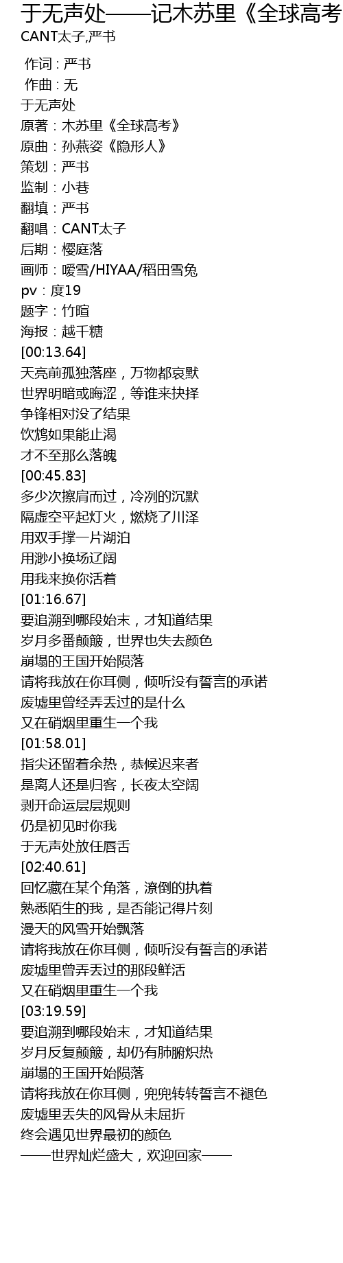 | [00:02.07] | 原著:木苏里《全球高考》 |