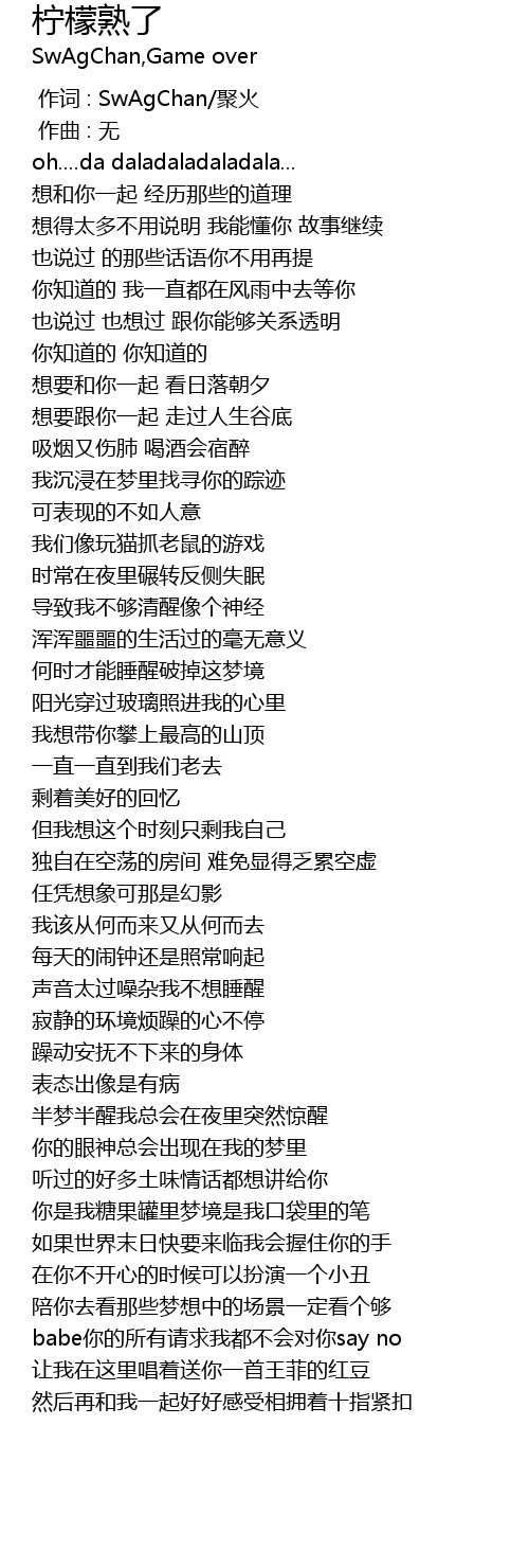 | [00:00.000] | 作词 : SwAgChan/聚火 |